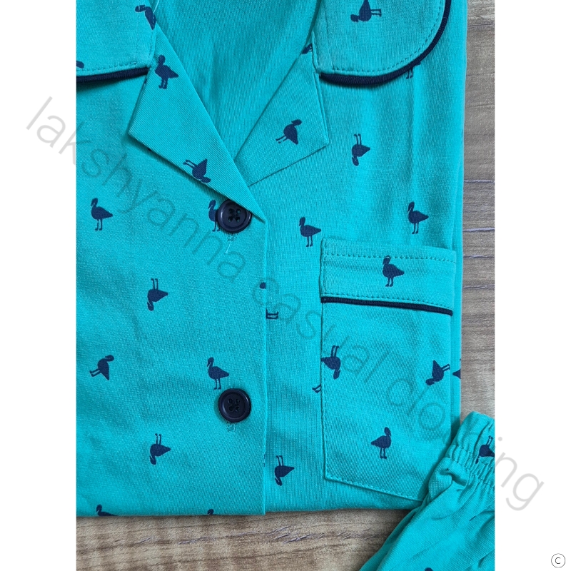 Soft cotton hosiery night suit in refreshing aqua blue with collar design, perfect for summer nights.