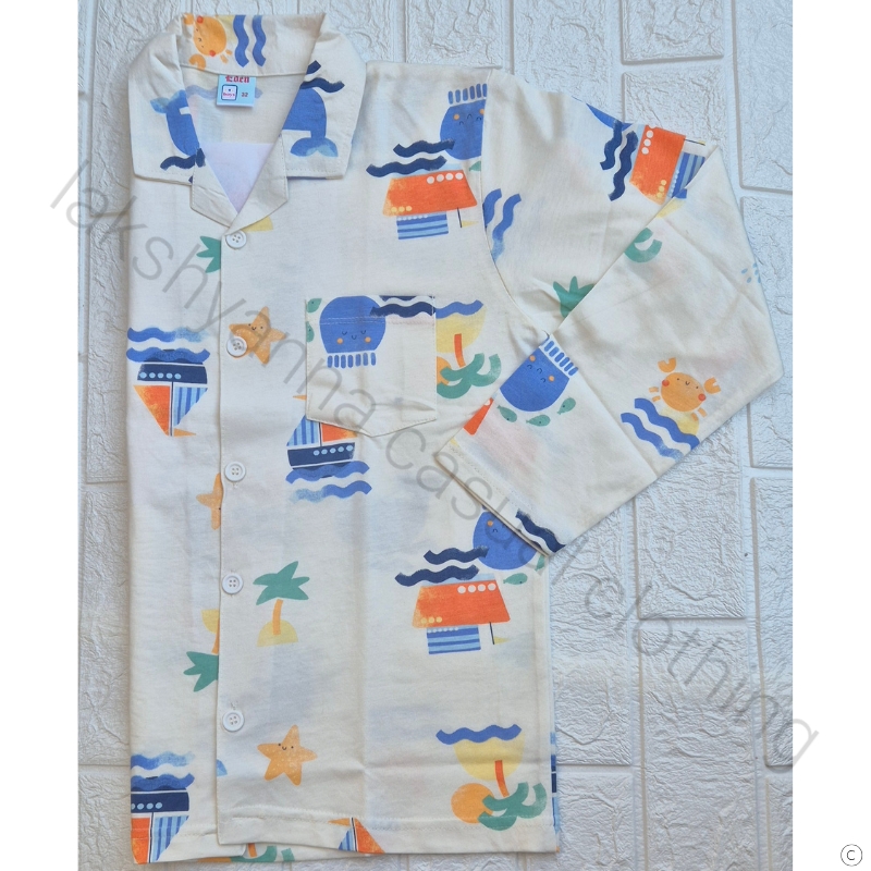 Classic off‑white collar night suit for boys in soft cotton hosiery. Full sleeves, breathable summer wear.