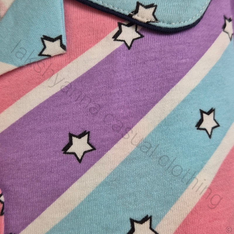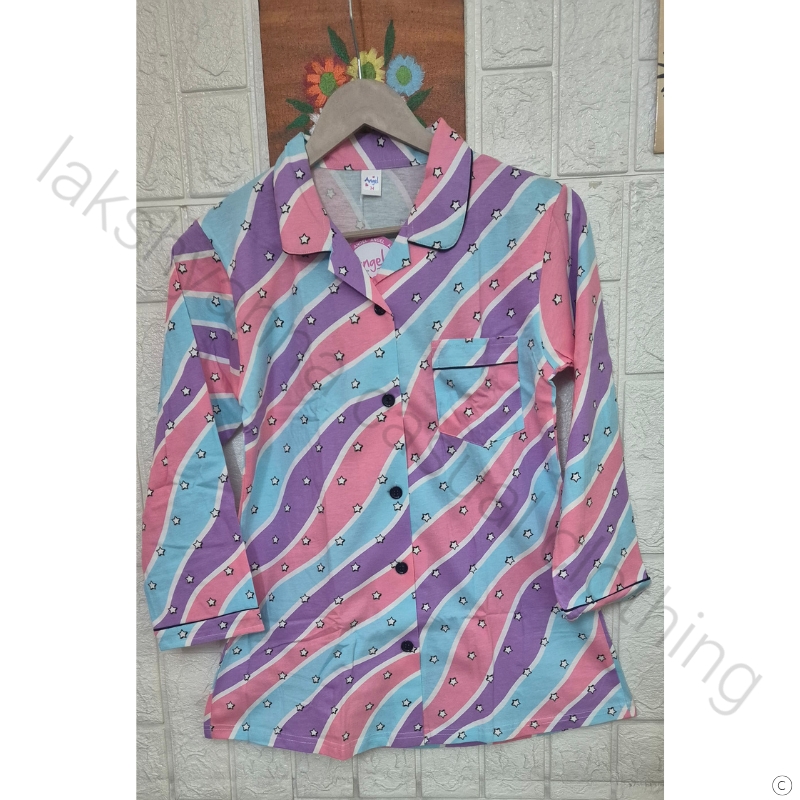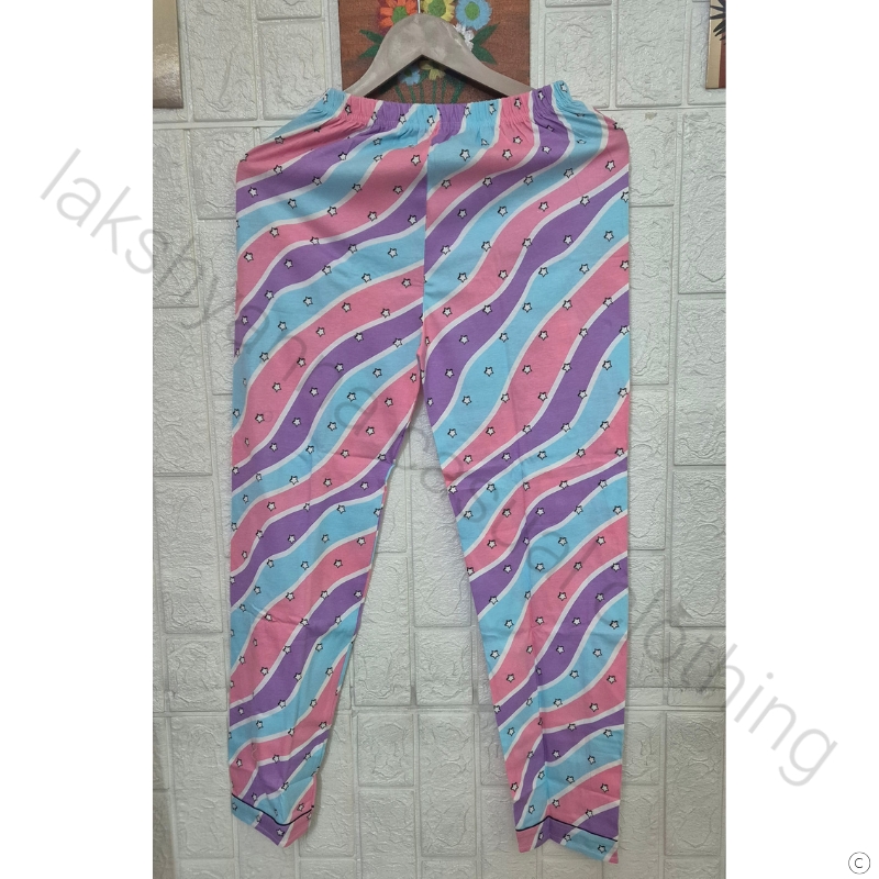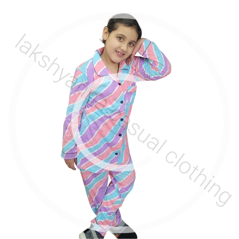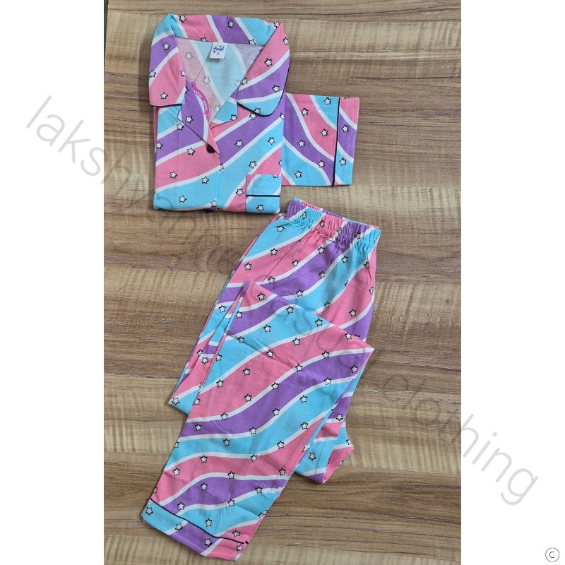 Soft sky‑with‑pink cotton hosiery night suit for girls, designed for breathable comfort and playful style. Available in two sizes(34 and 36).