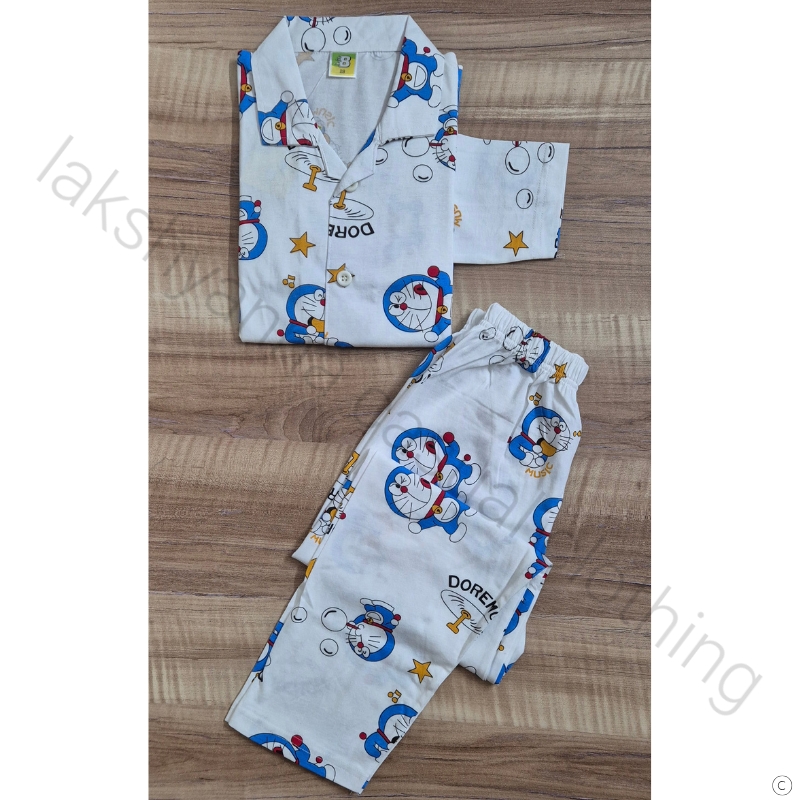 🦋 Design: White base with playful blue Doraemon print, front‑open shirt, full sleeves, and trouser set.