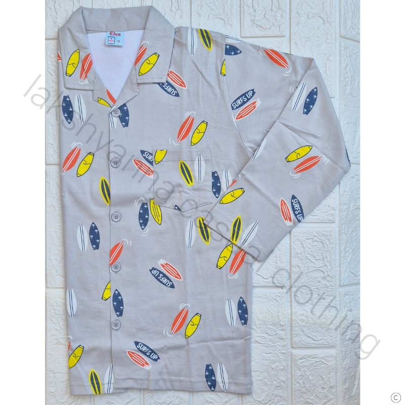 Premium boys’ collar night suits in soft cotton hosiery. Available in off‑white, sky blue, and grey. Full sleeves, summer comfort.