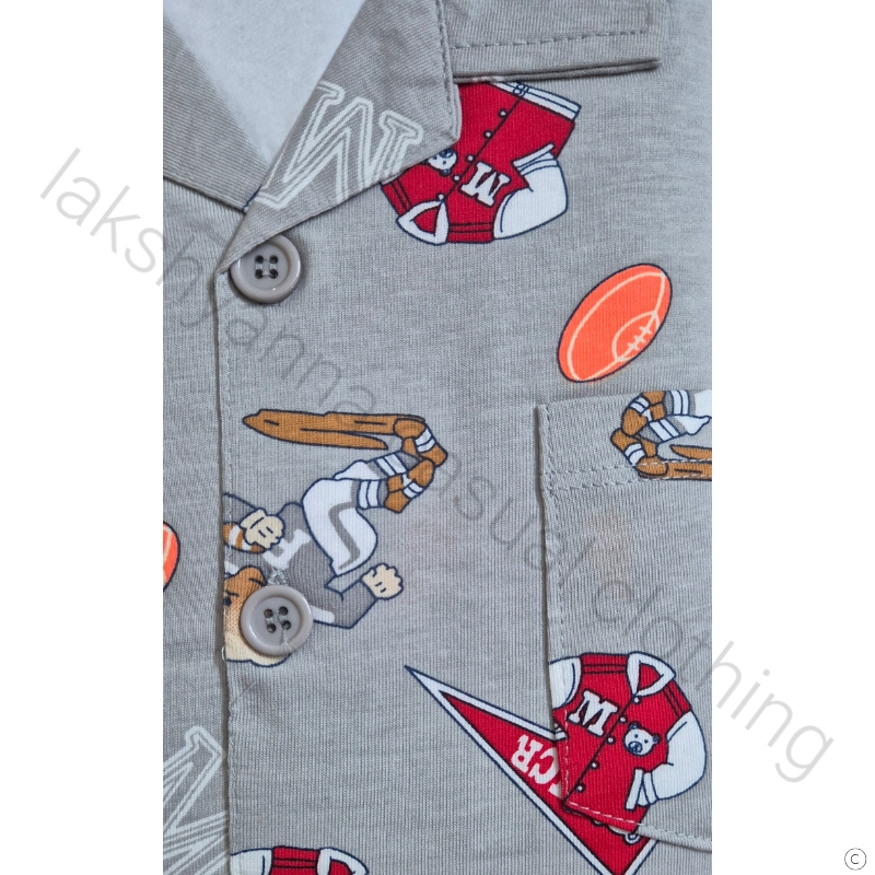 Keep your child cool and comfortable with this grey cotton hosiery printed night suit. Made from lightweight, super soft fabric, it features full sleeves and a front button closure for easy wear. Designed for summer evenings, casual lounging, or bedtime, this unisex set ensures gentle comfort without overheating. Available in sizes 2–3 (22), 3–4 (24), and 5–6 (26).